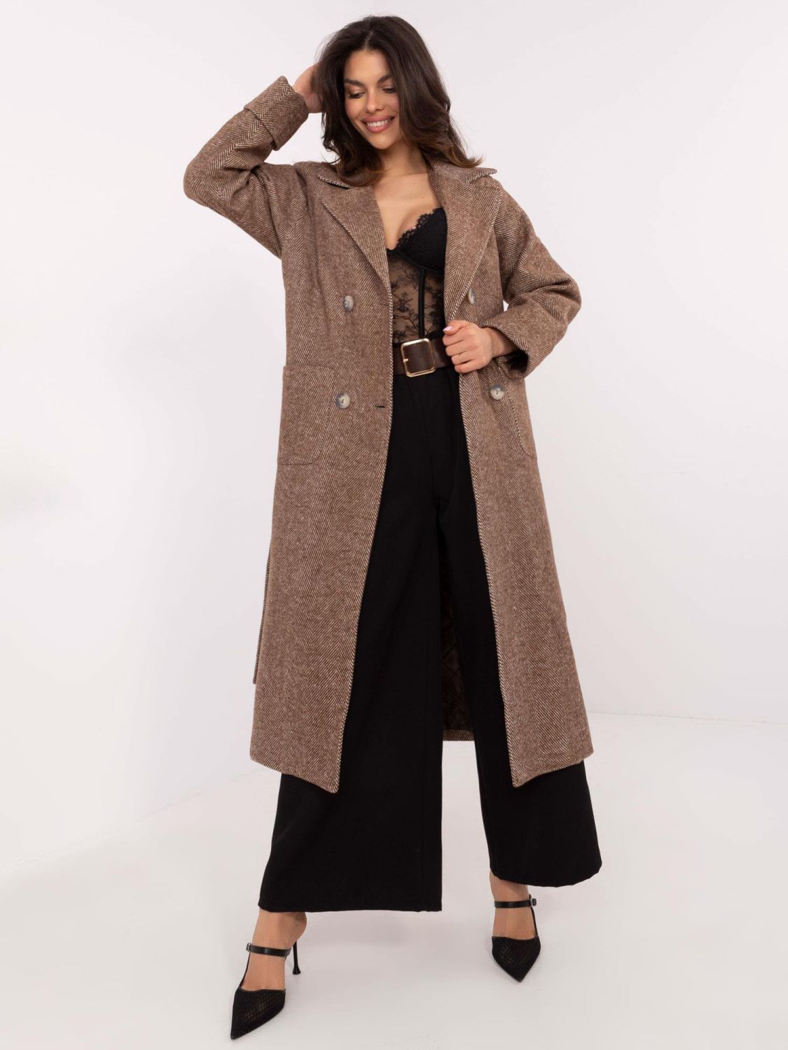 Entdecken Sie die perfekte Kombination aus Stil und Komfort mit unserem eleganten Übergangsmantel in Braun. Dieser Mantel, hergestellt aus hochwertiger Wolle (75%), Polyester (15%) und Elasthan (10%), ist ideal für den täglichen Gebrauch, zur Arbeit oder in der Freizeit. Lange Ärmel und der elegante Schnitt mit doppelter Knopfleiste und Gürtel verleihen dem Mantel ein raffiniertes Aussehen. Ohne Kapuze und mit gestepptem Futter ist dieser Mantel nicht nur stilvoll, sondern auch praktisch. Dank des langen Schnitts und der geräumigen Taschen wird er zu Ihrem Lieblingsstück für Herbst und Winter. Vergessen Sie nicht, dass er bei 30 °C in der Maschine gewaschen werden kann, was eine einfache Pflege gewährleistet.