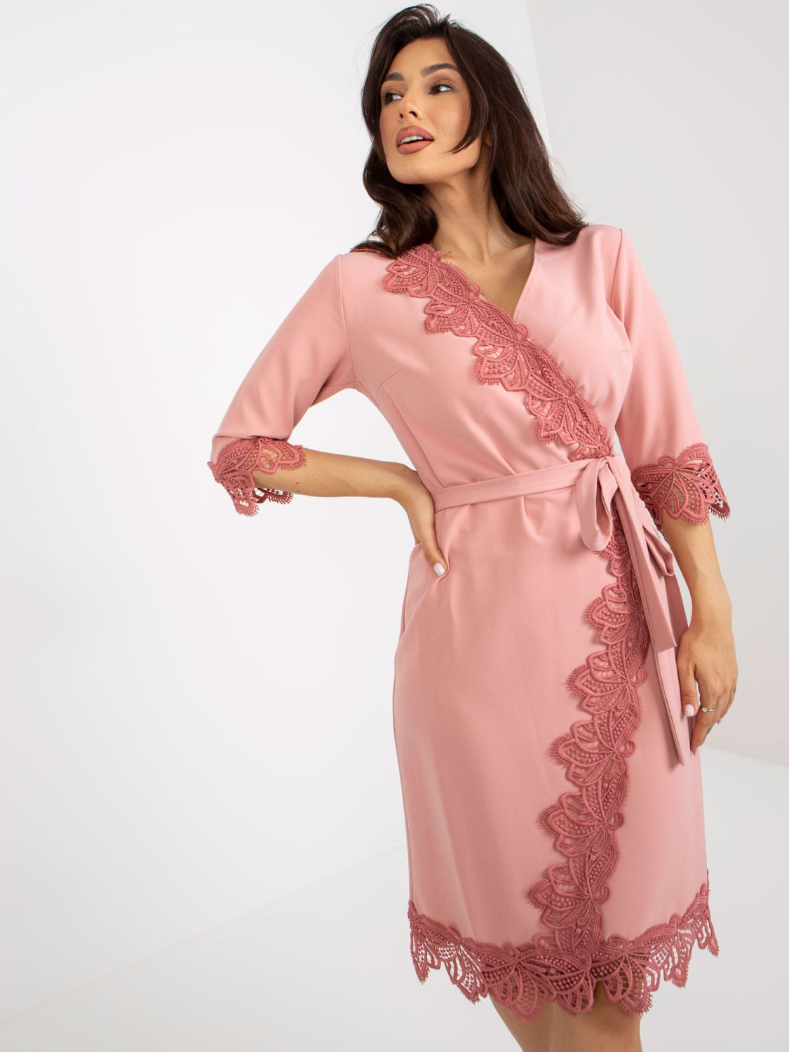 Entdecken Sie Eleganz und Komfort mit diesem rosa Cocktailkleid mit Wickeloptik und 3/4-Ärmeln. Das glatte Design und die Midi-Länge sind ideal für verschiedene Anlässe, sei es für die Arbeit, offizielle Treffen oder Hochzeiten. Das Kleid hat einen ausgestellten Schnitt, der Bewegungsfreiheit und Komfort den ganzen Tag über garantiert. Der Wickelausschnitt verleiht Charme und Weiblichkeit. Hergestellt aus hochwertigen Materialien, die aus 65% Polyester, 30% Baumwolle und 5% Elasthan bestehen, ist dieses Kleid nicht nur stilvoll, sondern auch praktisch, da es bei 30 °C in der Maschine gewaschen werden kann. Mit zusätzlicher Spitze als Detail wird es zu einem echten Modehighlight, das Sie lieben werden. Das Model auf dem Bild trägt Größe 36, ihre Maße sind: Höhe 164 cm, Brust 86 cm, Taille 67 cm und Hüfte 99 cm.