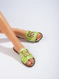 Entdecken Sie die perfekte Kombination aus Stil und Komfort mit unseren Damen grünen Sandalen mit goldener Verzierung. Diese eleganten Sandalen sind mit einer offenen Zehenpartie und ohne Absatz gestaltet, was maximalen Tragekomfort garantiert. Hergestellt aus hochwertigem ökologischem Leder, sind sie ideal für den täglichen Gebrauch in den Frühlings- und Sommermonaten. Ihr klassischer und lässiger Stil passt perfekt zu verschiedenen Outfits, egal ob Sie einen Stadtbummel machen oder am Strand entspannen. Dank des praktischen Schlupfdesigns lassen sich diese Sandalen leicht kombinieren und sind eine Bereicherung für Ihre Garderobe. Vergessen Sie nicht, sie Ihrer Kollektion hinzuzufügen!