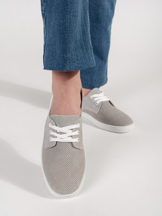 Entdecken Sie die perfekte Kombination aus Stil und Komfort mit unseren grauen perforierten Ledersneakern. Diese Sneaker bestehen aus hochwertigem 100% Naturleder, das nicht nur ein elegantes Aussehen, sondern auch maximalen Tragekomfort bietet. Mit einer geschlossenen Zehenpartie und einem weichen, geschlossenen Fersenbereich sind sie ideal für den täglichen Gebrauch. Dank der Schnürung können Sie sie genau nach Ihren Bedürfnissen anpassen. Mit einer Sohlenhöhe von 0 bis 3 cm sind diese Sneaker eine großartige Wahl für Frühling, Sommer und Herbst. Ihr sportlicher und lässiger Stil passt perfekt zu verschiedenen Outfits, egal ob Sie zur Arbeit gehen, spazieren gehen oder sich mit Freunden treffen. Vergessen Sie nicht, dass hochwertige Materialien und präzise Verarbeitung die Garantie für langfristige Zufriedenheit sind. Wählen Sie Komfort und Stil mit unseren Sneakern!