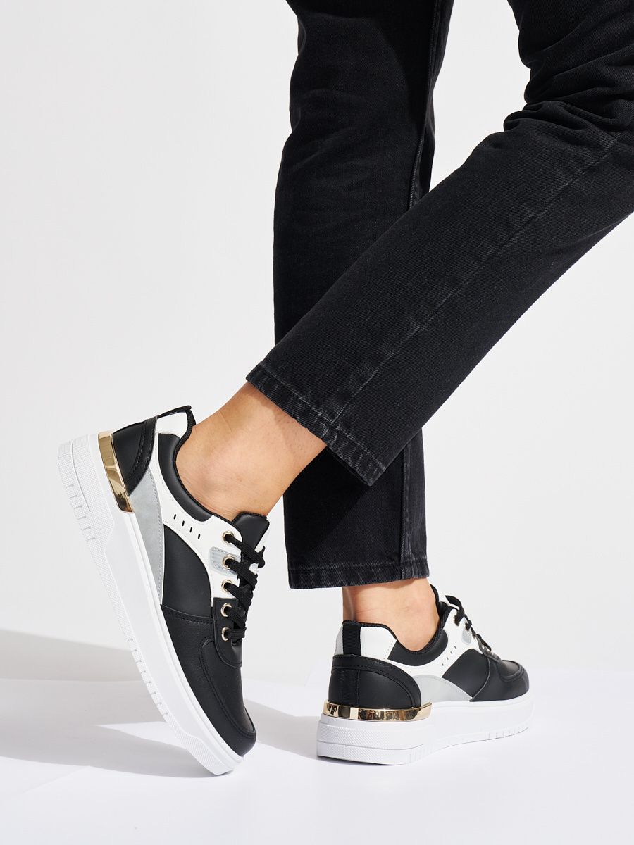 Entdecken Sie die perfekte Kombination aus Stil und Komfort mit unseren schwarz-weißen Sport Sneakers auf Plattform. Mit einer geschlossenen Zehenpartie und einem weichen, geschlossenen Fersenbereich sind diese Sneakers ideal für den täglichen Gebrauch. Dank der Plattformhöhe von 4 cm und einer Gesamthöhe der Schuhe zwischen 3 und 5 cm bieten sie Ihnen die nötige Höhe, ohne auf Komfort zu verzichten. Das Obermaterial aus ökologischem Leder und das textile Innenfutter sorgen nicht nur für ein modernes Aussehen, sondern auch für maximalen Komfort. Mit praktischer Schnürung und einer robusten Gummisohle mit Profil sind diese Sneakers eine großartige Wahl für Frühling, Sommer und Herbst. Egal, ob Sie einen Stadtbummel machen oder sich mit Freunden treffen, diese Sneakers lassen sich hervorragend mit verschiedenen Outfits kombinieren und verleihen Ihnen einen stilvollen Look.